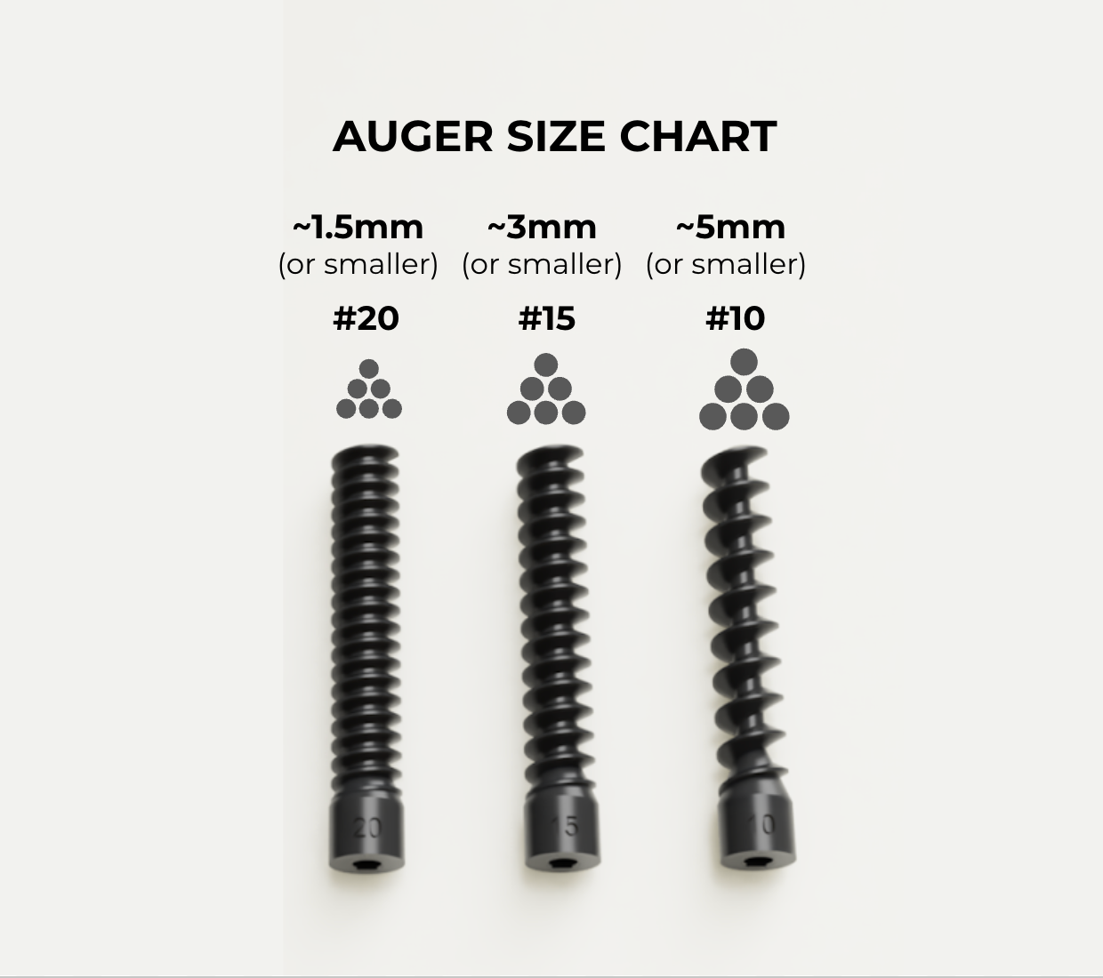 The Plank MINI features an interchangeable auger design, allowing you to effortlessly choose the appropriate auger.  If you mix feeds, select the largest size to match the diameter of the auger. The Plank MINI comes with three augers: #10, #15, and #20. Refer to the chart below for the appropriate foods to use with each auger.